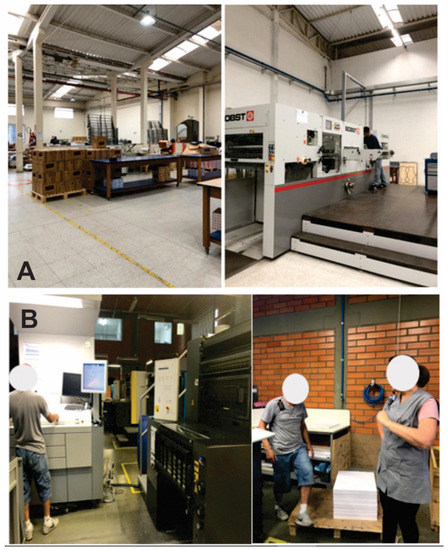Images of printing equipment and setup locations at each of the companies (A,B).
