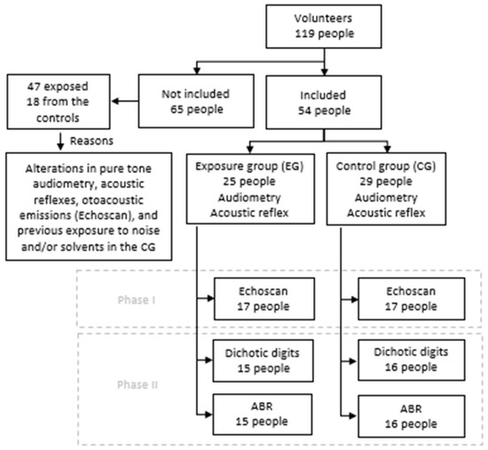 Figure 2 represents the flowchart of participants at each study phase. Sixty-five volunteers were excluded from the study for presenting middle ear alterations, average hearing thresholds (500, 1000, 2000, and 4000 Hz) > 25 dB HL, and absence of otoacoustic emissions and/or acoustic reflexes. Of the 65 individuals who volunteered to be in the study but did not meet the eligibility criteria, 18 were unexposed controls who were excluded for presenting middle ear alterations, average hearing thresholds (500, 1000, 2000, and 4000 Hz) > 25 dB HL, and/or previous exposure to noise and/or solvents.