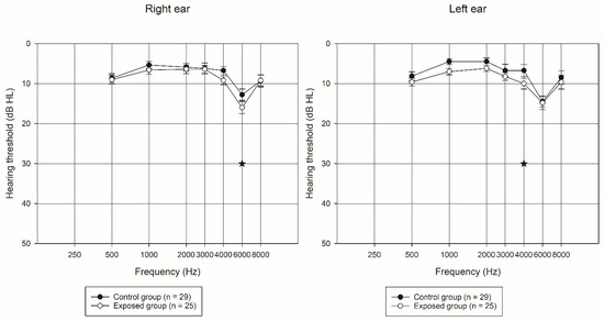 Mean hearing thresholds (+/− one standard error) by ear and exposure group. Star symbol denotes significant differences at the p < 0.05 level between study groups.