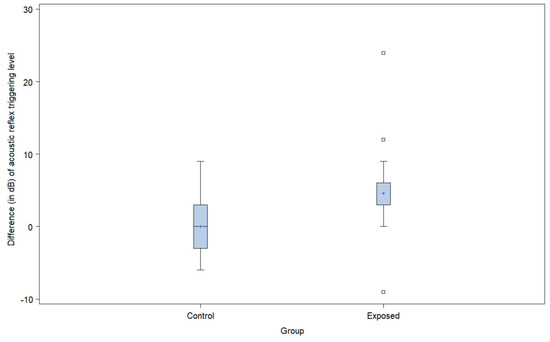 Boxplot of the difference (in dB) of acoustic reflex triggering levels before and after the participant’s work shift, by exposure group.