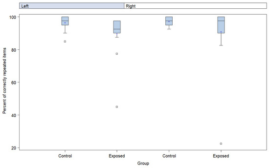 In the dichotic digits test, worse results were observed in the exposure group (Figure 5), with a nearly significant difference being observed for the left ear compared to the control group, suggesting alterations in central auditory functions. A value close to the significance level (p = 0.064) was observed in the analysis of the exposure effect. This finding is in agreement with those from Fuente et al. [9], Fuente and McPherson, [10], Fuente et al. [11,13], Landry and Fuente [52]. Fuente et al. [11] suggested that the dichotic digits test could be an important tool to detect central auditory disorders associated with exposure to solvents. It is also noteworthy that the averages of the results obtained in both ears of the participants in the exposure group were poorer than the threshold of normality used to classify test results [37].
