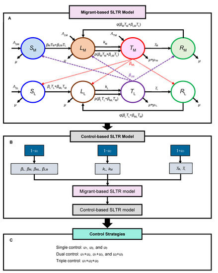 Schematic showing (A) the migration-based TB transmission model. The compartmental susceptible (S)–latently infected (L)–infectious tuberculosis (T)–recovered (R) (SLTR) model for assessing the impact of migration on TB epidemics on a regional scale. M: migrant subpopulation; L: local subpopulation. (B) The control-based SLTR model with different control strategies (combinations) based on distancing control (u1), early screening control (u2), and directly observed treatment, short-course (DOTS) control (u3). (C) The control intervention schemes were considered in single, dual, and triple combinations (see text for symbol meanings).