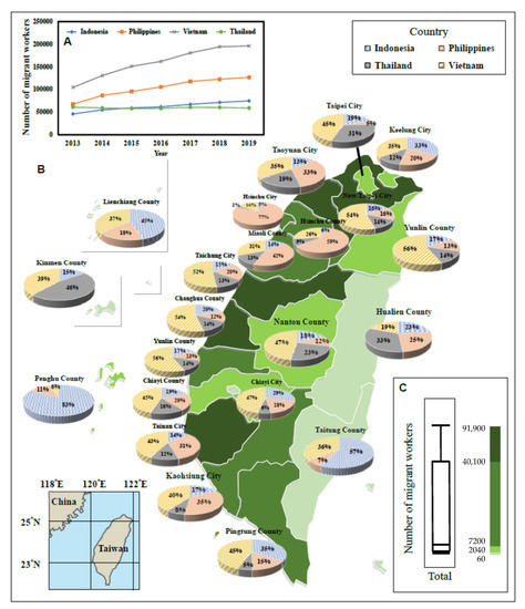 (A) Numbers of migrant workers in Taiwan from Indonesia, the Philippines, Thailand, and Vietnam per year in the period 2013–2019. (B) Migrant workers by nationality as percentages of the total numbers in each city and county in 2018. (C) Statistical distribution of total number of migrant workers according to box–whisker plot (box plot: 25th–75th percentile; whisker plot: 2.5th–97.5th percentile; middle line: median). Data were adopted from the Ministry of Labor Republic [27].