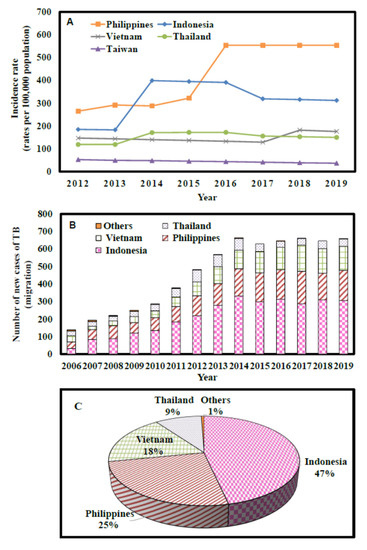 (A) Country-specific incidence rates per 100,000 population in the period 2012–2019 in Taiwan region (WHO [1]). (B) Cases of confirmed tuberculosis (TB) among migrant workers in Taiwan in the period 2006–2019 (Taiwan CDC [28]). (C) Country-specific contribution percentage (%) among the confirmed cases of TB (Taiwan CDC [28]).