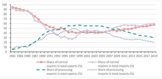 - The domestic environmental impact of increased normal exports should be prioritized. With the improvement of firms’ learning ability through processing trade after the reform and opening up [61], industries with a high proportion of processing trade, such as textiles, have gradually shifted from processing exports to normal exports while the normal and processing export shares of relatively clean industries, such as machinery and equipment manufacturing, have increased. Normal exports consume more domestic intermediate inputs than processing exports, resulting in a greater impact on domestic pollution. As a result, environmental regulations should be tightened even further to mitigate the negative consequences of increased normal exports on the domestic environment.