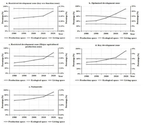 During the study period, the production space of different types of MFZs varied greatly. The proportion of production space in optimized development zone was the highest (>50%) and showed a gradual decline trend, followed by the proportion of production space in key development zone (>36%), which also showed a continuous decline trend. The proportion of production space in restricted development zone (key eco-function zone) is <10%, and the proportion of production space in restricted development zone (major agricultural production zone) is approximately 30%, both showing a continuous increase trend. During the study period, the living space of different types of MFZs showed an overall increasing trend. The living space proportion of restricted development zone (key eco-function zone) was the lowest (<0.60%), followed by restricted development zone (major agricultural production zone), which accounted for <4%; while the living space proportion of optimized development zone was the highest, which increased from 9.90% in 1980 to 22.28% in 2020.