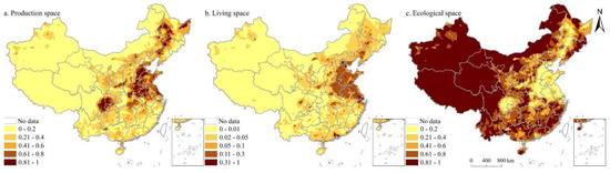 - During the study period, China’s ecological space was absolutely dominant, and its proportion continued to decrease, while the production space and living space continued to increase. There were significant differences in the proportion of PLES in different types of MFZs.
