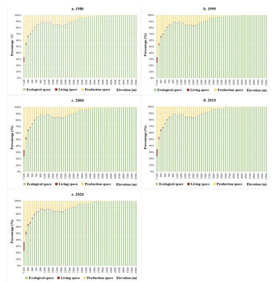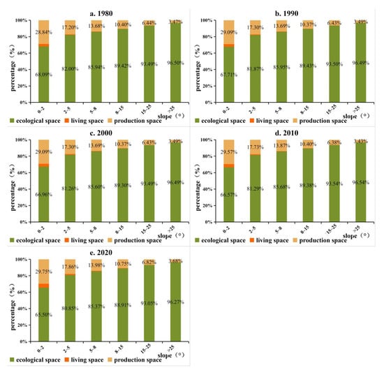 Owing to its vast territory, complex terrain, and diverse climate, China’s territorial space utilization types are significantly different. Production space and living space showed similar spatial distribution patterns during the study period, mainly distributed in the east of Hu line (Figure 3). Specifically, production space and living space are mainly distributed in the Sichuan Basin, North China Plain, Guanzhong Plain, Northeast Plain, the Middle-Lower Yangtze River Plain, and the Pearl River Delta Region. In addition, there is more production space and living space in the surrounding areas of provincial capital cities, urban agglomeration areas, and major transportation routes. Ecological space is concentrated in the west of Hu line and mountainous areas in the east of Hu line, such as the Lesser Khingan Mountains, Changbai Mountains, T’ai-hang Mountains, Dabie Mountains, Wushan Mountains, Xuefeng Mountains, Nan Mountains, and Wuyi Mountains. Besides, the vertical gradient of China’s territorial space is obviously differentiated (Figure 4). A total of 27.60% of the total territorial space is concentrated below 500 m, accounting for 15.81% within 500~1000 m, 17.88% within 1000~1500 m, and 6.68% within 1500~2000 m. The proportion of territorial space above 4000 m is 20.00%. From 1980 to 2020, the proportion of PLES at different elevations did not change significantly. With the increase in elevation, the proportion of living space continued to decrease, the proportion of production space first decreased, then increased, and then decreased, whereas the proportion of ecological space first increased, then decreased, and then increased. Specifically, the proportion of production space in the range of 0~1200 m continued to decrease and gradually increased in the range of 1200~1600 m, and then showed an overall decreasing trend. The change trend of ecological space showed the opposite. Below 100 m, production space was more than 50%, while ecological space was over 30%. The ecological space between 100 and 200 m accounted for >50%, while the production space accounted for >40%. In China, the proportions of 0~2°, 2~5°, 5~8°, 8~15°, 15~25°, and >25° are 40.89%, 16.95%, 10.51%, 15.77%, 10.88%, and 5.01%, respectively. It can be found that the territorial space is mainly concentrated below 5° (Figure 5). From 1980 to 2020, the proportion of PLES in different slopes had little change. The proportion of production space and living space decreased with the increase in slope, while the proportion of ecological space increased.