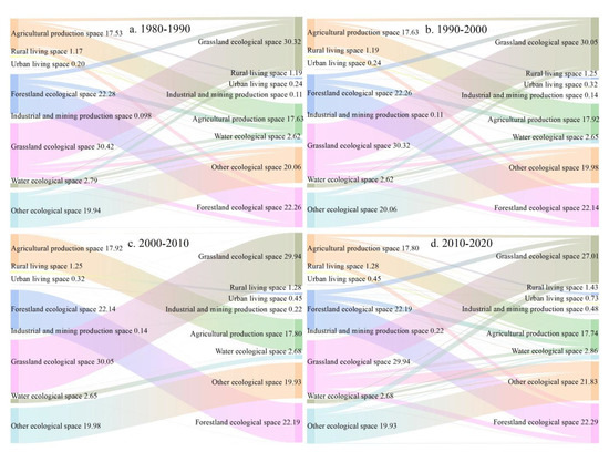 Based on the conversion of PLES between 1980 and 2020, this study visualized land use transition matrices of four periods by using Sankey diagram (Figure 6). From 1980 to 1990, the range of grassland ecological space and agricultural production space to forestland ecological space was 25,325.47 km2 and 251,574.11 km2, respectively. The area of grassland ecological space converted to other space was the largest, reaching 681,424.70 km2. Meanwhile, the area of other space converted to grassland ecological space was also the largest, reaching 672,171.73 km2. The area of agricultural production space converted to other space reached 578,143.31 km2. The conversion of industrial and mining production space to other space was the smallest, and the area of other space to forestland ecological space was also relatively large, reaching 543,864.98 km2. From 1990 to 2000, the conversion of forestland ecological space to agricultural production space, forestland ecological space to grassland ecological space, and other ecological space to grassland ecological space were relatively evident, accounting for 21.95%, 21.34%, and 18.19% of the national spatial transformation area, respectively. From 1990 to 2000, the area of grassland ecological space converted to other space was the largest, reaching 695,586.91 km2, followed by agricultural production space and forestland production space converted to other space, reaching 582,231.59 km2 and 555,507.73 km2. The grassland ecological space converted from other space was the largest, reaching 668,095.14 km2, followed by the agricultural production space and forestland ecological space converted from other space, reaching 611,079.11 km2 and 543,198.54 km2, respectively.