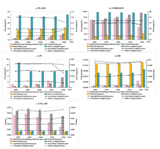 During the study period, the proportions of industrial and mining production space, urban living space, and rural living space continued to increase, while the water ecological space decreased from 1980 to 1990 and continued to increase from 1990 to 2020. From 1980 to 2000, the agricultural production space increased continuously, and then decreased continuously in the following 20 years. On the contrary, the forestland ecological space decreased continuously from 1980 to 2000 and increased continuously in the following 20 years. During the study period, grassland ecological space continued to decrease, while other ecological space showed a general decline trend. The COHESION index of ecological space was significantly higher than that of living space and production space, and the COHESION index of rural living space was the lowest (Figure 7b). During the study period, the COHESION index of urban living space and rural living space continued to increase, indicating that the agglomeration degree of living space increased significantly, while the ecological space of water area continued to decrease, and the COHESION index of industrial and mining production space increased first and then decreased, while other types of territorial space had little change. The LPI of forestland ecological space, grassland ecological space, and other ecological space was significantly higher than that of other territorial space types, and the proportion of industrial and mining production space, urban living space, and rural living space was relatively low (Figure 7c). The PD index of agricultural production space and grassland ecological space was higher than that of industrial and mining production space and urban living space (Figure 7d). The PD of industrial and mining production space, urban living space, rural living space, and forestland ecological space increased during the study period. The ENN_MN of industrial and mining production space and urban living space is relatively larger, followed by rural living space and water ecological space (Figure 7e).