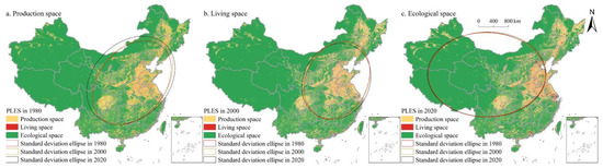 Based on Equations (2)–(5), this study drew the standard deviation ellipse of PLES in China from 1980 to 2020, which was used to analyze the overall patterns of China’s territorial spatial distribution and its spatial movement direction (Figure 8). Production space and living space form a northeast–southwest spatial distribution pattern, and ecological space form an east–west spatial distribution pattern. From 1980 to 2020, the standard deviation ellipse area of China’s production space increased, and the growth in the Y-axis direction was significantly higher than that in the X-axis direction, indicating that the production space expanded significantly along the Y-axis direction, namely the northwest to southeast direction. The gravity center of production space shifted 50.931 km to the northwest from 1980 to 2000, and 66.426 km to the northwest from 2000 to 2020 (Table 3). During the study period, the standard deviation ellipse area of living space increased, and the growth in the Y-axis direction was significantly higher than that in the X-axis direction, indicating that the living space expanded significantly along the Y-axis direction, namely the northwest to southeast direction. From 1980 to 2010, the gravity center of living space shifted 55.550 km to the southwest, and 51.639 km to the northwest from 2010 to 2020. During the study period, the standard deviation ellipse area of ecological space was small, and the center of ecological space gravity shifted 25.224 km to southwest China from 1980 to 2020.
