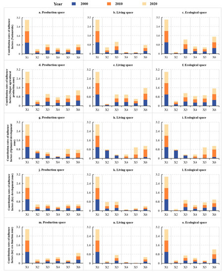 In the optimized development zone, the impact of each influencing factor on PLES fluctuated greatly in different years. Specifically, the impact of X2 and X3 on production space and living space in 2000 was significantly higher than that in 2010 and 2020, while the impact of X2 and X3 on ecological space in 2010 and 2020 was significantly higher than that in 2000. The impact of X4 on ecological space was higher than that of production space and living space, the impact of X5 on production space was significantly higher than that of living space and ecological space, and the impact of X6 on living space was the biggest. In key development zone, the impact of X2 on production space and living space was significantly higher than that of ecological space, and the impact of X3 on ecological space was significantly higher than that of living space and production space. The impact of X4 and X5 on living space was significantly lower than that of production space and ecological space. The impact of X6 on ecological space was significantly higher than that of living space and production space. In key eco-function zone, the impact of X2 on PLES increased gradually, while the impact of X3 on production space and ecological space gradually decreased, and the impact on living space gradually increased. The impact of X4 and X5 on production space were higher than those of ecological space and living space, and the impact of X6 on ecological space was significantly higher than those of production space and living space.