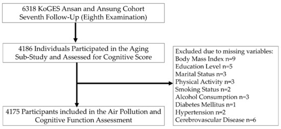 In the present investigation, we used the most recent and largest follow-up data available for air pollution (PM2.5 and PM10) and cognitive assessment scores. A flowchart of the study participants is shown in Figure 1. Among 6318 participants from the seventh follow-up, 2132 individuals had not participated in the aging sub-study and thus were excluded from the cognitive test. An additional 11 participants were excluded because of missing covariates, such as body mass index (BMI) (n = 9), education level (n = 5), marital status (n = 3), physical activity (n = 3), smoking (n = 2), alcohol consumption (n = 3), diabetes mellitus (n = 1), hypertension (n = 2), and cerebrovascular disease (n = 6), resulting in a total of 4175 participants available for investigation. The study protocol was approved by the Institutional Review Board of the Korea National Institute of Health and the Korea Centers for Disease Control and Prevention. All participants provided their written consent.