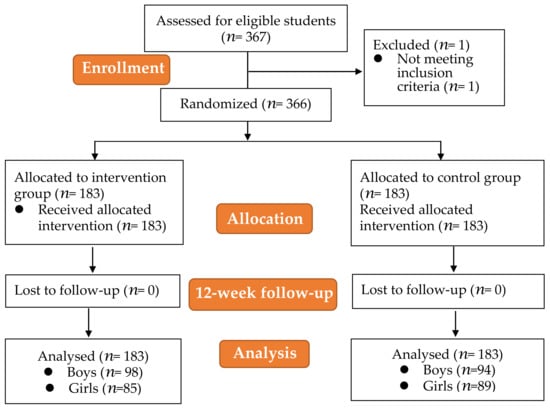 A random sample of 367 students from 8 classes in an elementary school in Hangzhou, Zhejiang Province, China, who voluntarily participated in this study were selected. Because children in grades 1 and 2 were cognitively limited and unable to complete the questionnaire independently, this study was conducted on a random sample of grades 3–5 only. The enrolled students were required to be able perform physical fitness tests (e.g., sprints, sit-ups, rope skipping) and not participate in the school’s after-school sports club. A total of 367 candidates were recruited for the study, and 366 volunteers met the inclusion criteria; one was excluded due to a medical condition that prevented him from participating and completing the physical fitness test, as described in Figure 2. Prior to the study, we collected demographic information on these students and then assigned them to the intervention group (n = 183) or the control group (n = 183). A total of 366 students received and completed a baseline test (containing a psychological questionnaire test and physical fitness tests), a 12-week follow-up examination, and a second repeat test.