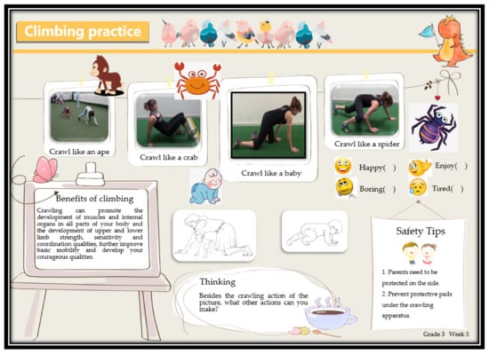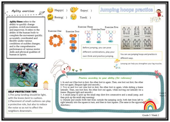 The experimental group completed the “Exercise Methods and Wellness Knowledge Guide” (EMWKG) leaflet intervention in addition to the original PE homework. The EMWKG flipchart is based on several educational themes, using a combination of text and cartoon illustrations to stimulate children’s interest in learning including learning knowledge and skills outside the classroom to enhance the health of the children and their families. For example, Figure 3 and Figure 4, respectively, present the contents of the flipchart for the fifth week of the third grade and the second week of the fifth grade. One page of loose-leaf printed intervention materials was distributed weekly to the test group students by the physical education teacher, and the intervention materials were provided one week in advance by the investigator. The total intervention period was 12 weeks, with materials distributed every Monday. The themes of each week’s intervention are shown in Table 4. At the first distribution, each student was provided with a cartoon plastic file bag to hold the weekly intervention materials and a free set of agility ladder practice equipment. Each printed page had four cartoon options for students to check off in response to the content of the booklet: happy, like, bored, and very tired. students’ booklets were collected by the researcher after 12 weeks of intervention. Students in the intervention group were told that they could not share EMWKG materials with their classmates.