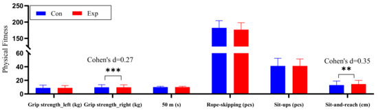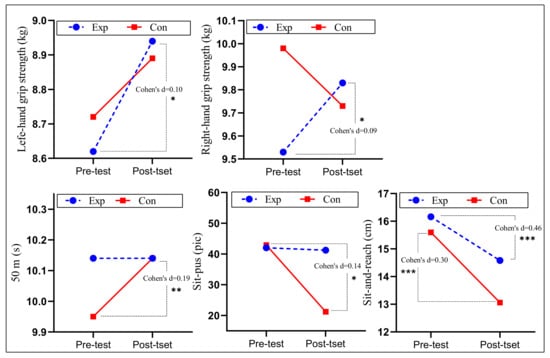 The results for the intra-group differences before and after the intervention in the control group are shown (Table 5 and Figure 5). The intervention group showed significant improvements in both left–and right–handed grip-strength tests (Cohen’s d = 0.10 and 0.09, p < 0.05), but a significant decrease in sit-and-reach (Cohen’s d 0.3, p < 0.001). Students in the control group showed significant decreases in three indicators: 50 m (Cohen’s d = 0.19, p < 0.01), sit-ups (Cohen’s d = 0.14, p < 0.05), as well as sit-and-reach (Cohen’s d = 0.46, p < 0.001).