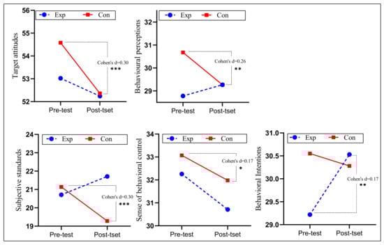 Table 7 and Figure 7 give the descriptive statistics for the students’ within-group preintervention and postintervention attitudes toward exercise. Students in the experimental group showed improved behavioral perceptions, behavioral habits, emotional experience, subjective standards, and behavioral intentions in the exercise attitude component compared with pre-intervention, with behavioral intention (Cohen’s d = 0.17, p < 0.01) being significantly higher. The control group showed significantly lower target attitudes (Cohen’s d = 0.3, p < 0.001), behavioral perceptions (Cohen’s d = 0.26, p < 0.01), sense of behavioral control (Cohen’s d = 0.17, p < 0.05), and subjective standards (Cohen’s d = 0.30, p < 0.001) in the exercise attitude component compared with the baseline test.
