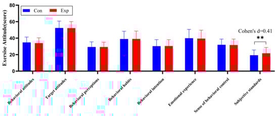 After adjusting for covariates, we found non-significant differences in the exercise attitudes component, except for subjective standards (F = 15.461, p < 0.001, η2p = 0.043), which showed statistically significant differences between groups (Shown in Table 8). We also found no significant interaction effects for behavioral attitudes, target attitudes, behavioral perceptions, behavioral habits, behavioral intentions, emotional experiences, sense of behavioral control, or subjective standards. Bonferroni post hoc comparison showed that the subjective standards score was 2.535 points (95% CI: 1.267–3.803, p < 0.05, Cohen’s d = 0.41) higher in the experimental group than in the control group (Shown in Figure 8).