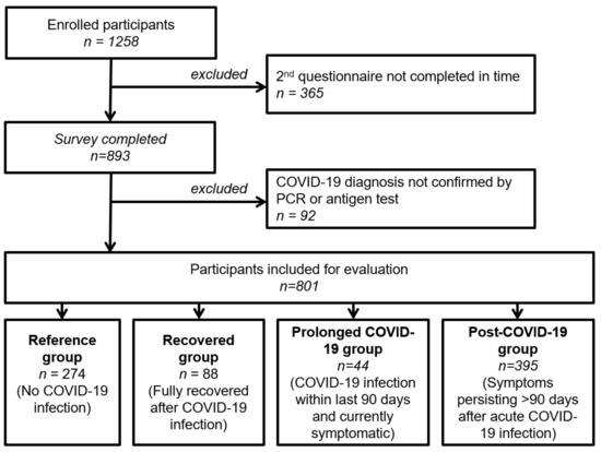 According to their COVID-19 disease history, four groups were formed and compared for the present analysis: (1) Participants not infected by SARS-CoV-2 (in the following referred to as the “reference group”), (2) participants with a previous COVID-19 infection who were fully recovered (in the following referred to as the “recovered group”), (3) participants with an acute SARS-CoV-2 infection or previous infection within the last 90 days and ongoing pro-longed symptoms (in the following referred to as the “prolonged COVID” group), (4) participants with a previous COVID-19 infection and persisting symptoms for more than 90 days (in the following referred to as the “post-COVID-19” group). Participants who had not answered the second questionnaire before the beginning of March 2022 or who stated that their COVID-19 diagnosis was neither confirmed by a PCR nor an antigen test were excluded from the evaluation.