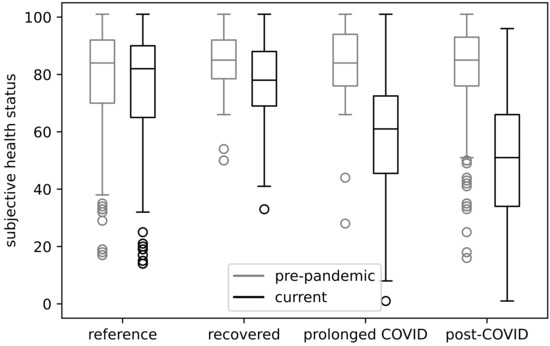 Regarding the subjective rating of the overall health status prior to the pandemic, there were no significant differences between any of the four groups. Average values on the subjective 100-value scale were (with standard deviations in brackets): reference group μ = 80.1 (± 17.8), recovered patients μ = 84.8 (± 11.1), prolonged COVID group μ = 82.3 (± 15.6), and post-COVID patients μ = 82.4 (± 15.0).