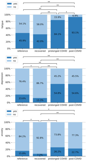 The evaluation of the depression questionnaire PHQ-9 showed that 23.6% of the reference group had depression symptoms, which is significantly higher than the 13.3% of recovered patients. By contrast, 54.8% and 54.6% of the prolonged and post-COVID-19 patients in our survey exhibited depression. Both being significantly above the former two groups. Prolonged and post-COVID-19 groups did not differ significantly from each other in terms of depression.