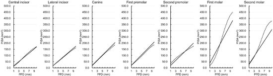 Formulas quantifying the PESA of 14 tooth types except the third molars were generated using the results of a previous study in Japan []. Extracted teeth used in the previous study were selected randomly from more than 20,000 extracted teeth collected from 130 dentists across Japan.