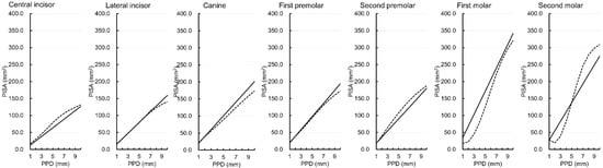 Figure 2 shows the simulated PISA of each tooth type except the third molar in the mandible. The PISAs of the lateral incisor and the first premolar were similar between the two versions from PPDs of 1 to 8 mm. The PISAs of the central incisor, canine, second premolar, and first molar were smaller in the Japanese version than in the original version. When the PPD value ranged from 1 to 4 mm, the Japanese version of the PISA for the second molars showed larger values than the original version. However, when the PPD value ranged from 5 to 10 mm, the PISA values obtained from the Japanese version for the second molar showed smaller values than those obtained from the original version.