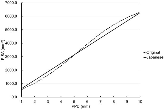 The difference in the total PISA, especially for PPD up to 5 mm and PISA up to 3000 mm2, is critical for evaluating the PISA value as precisely as possible because such values are commonly observed in clinical practice, as well as in epidemiological surveys []. A clinical study from South Korea reported mean (SD) PISA values of 116 (16), 260 (30), and 407 (94) mm2 for mild, moderate, and severe periodontal disease, respectively []. A clinical study from Spain showed that mean (SD) PISA values for the periodontally healthy group and mild, moderate, and severe periodontitis groups were 34 (16), 293 (98), 646 (86), and 2309 (588) mm2, respectively []. A retrospective clinical study assessing periodontal treatment in Japan reported median PISA values of 1271 mm2 at the first examination, 212 mm2 at the end of the initial preparation, 51 mm2 at the supportive periodontal therapy (SPT) transition, and 30 mm2 at the latest SPT []. Because the total PISA in the Japanese version for PPD from 1 to 5 mm was approximately 1.01 to 1.21 times higher than the original version’s PISA in the present study, accuracy can be improved by using the Japanese version for Japanese patients.