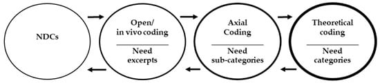 The data analysis is guided by [22] theoretical coding (p. 250), axial coding (p. 244), and open or initial coding (p. 110) with a mix of in vivo coding (p. 105) methods followed by three cycles of analysis. In the first cycle analysis, the needs communicated in NDCs are divided into discrete need patterns following open coding, and specific words or phrases specifying emphasis or critical needs are retained following in vivo coding. The variety of 55 discrete need factors/patterns is then harmonized into 17 axial codes (sub-categories) in the second cycle analysis. In the third cycle of analysis, 17 sub-categories are then aggregated into 7 key categories that structure the conceptual framework of grounded needs guided by theoretical coding. Finally, to facilitate a conceptual framework of needs, 55 need factors and 17 sub-categories of needs are aggregated into 7 key categories. The coding process remained iterative at each stage of analysis (Figure 1) and was validated by independent reviewers in a focus group discussion moderated by the author. All the need factors, sub-categories, and categories are discussed one by one to confirm the appropriateness of the wording used in given codes and their relationships and interdependence. NVIVO software is used to code and analyze the data.