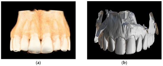 (a) Cone-beam computed tomography (CBCT) image presenting patient’s maxilla; (b) patient’s intraoral scan of upper arch.