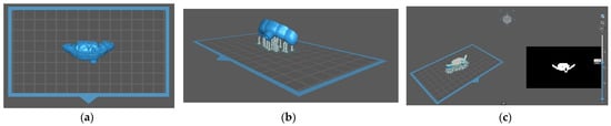 (a) STL file of the guide imported to the slicer software (Chitubox); (b) image after adding connectors for printing; (c) software showing object sliced into 50 µm layers. Each layer can be displayed and checked.