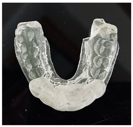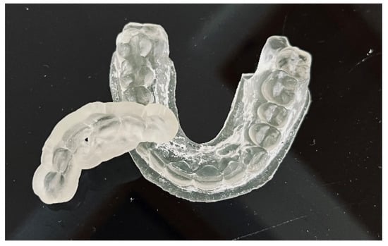 After the implant position was accepted by a clinician, an endodontic guide (teeth-supported) was designed for a sleeveless, static navigation of the image obtained from an intraoral scan (Figure 12). The guide covered the labial and palatal surfaces of the adjacent teeth (13-23) to obtain adequate intraoral stabilization. The use of stabilizing pins is unnecessary in such cases. The guide tube was designed so that the top of the sleeve was 21 mm from the radiographically visible root canal lumen. The guide sleeve was 6 mm long and 1.5 mm in diameter. The endodontic guide was printed on a resin 3D printer (Phrozen Sonic Mini 4K) using a transparent resin designed for printing surgical guides (NextDent SG)—a class IIa product that can be used in the oral cavity (Figure 13). Post-processing was conducted in accordance with the resin manufacturer’s instructions to avoid dimensional changes [24]. A master model was printed to check the accuracy of the guide’s fitting (Figure 14).