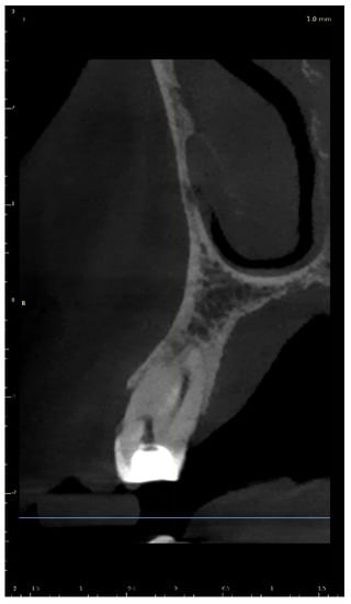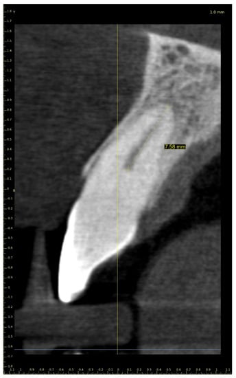 CBCT sagittal view image revealed a 7.58-mm-long visible part of the root canal on tooth 21 (FDI).