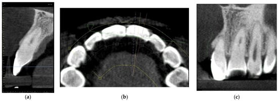 A 21-year-old female patient reported to the endodontic specialist complaining of moderate pain upon percussion of her maxillary central left incisor (tooth 21), experienced for several weeks. The patient was healthy and had no general or chronic diseases. Her dental history revealed that she had experienced dental trauma a few years earlier. The clinical examination revealed a slightly discoloured maxillary left central incisor, tenderness to percussion, a negative response to the pulp sensibility test (cold test), and moderate pain during soft tissue palpation in the apical region of the maxillary central left incisor. Radiographic images revealed the pulp canal calcification and an absence of the canal light that extended to the middle. A CBCT scan was performed (CS 8100 3D, Carestream, 50 × 50 mm) that confirmed canal calcification. The root canal lumen was visible 7.58 mm from the apex (Figure 8). Due to the possible risk of higher tooth substance loss and perforation during endodontic access, we decided to perform the endodontic treatment with guided access.