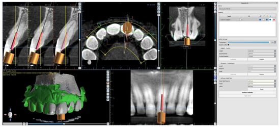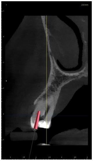 The upper arch was scanned with an intraoral scanner (PrimeScan, Dentsply Sirona) instead of analogue impressions. The STL file of the upper arch and the CBCT images were combined in Blue Sky Plan (Blue Sky Bio). The accuracy of the merging was cross-checked in three dimensions (Figure 9). An individual virtual implant with a diameter of 1.5 mm was used during planning, in accordance with the diameter of the endodontic access tool (Figure 10). The CBCT images allowed us to plan the position of the virtual implant so that the drill apex was located at the top of the visible part of the root canal system [23] (Figure 11).