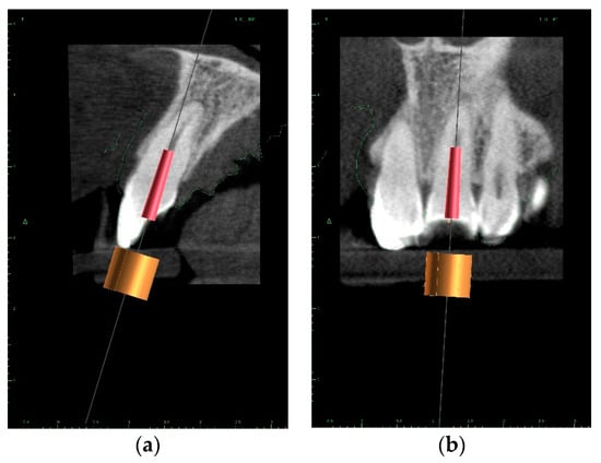 CBCT image presenting a scheduled virtual implant: endodontic access path in (a) sagittal view and (b) coronal view. The volume of the preserved dentin around the access path is shown.