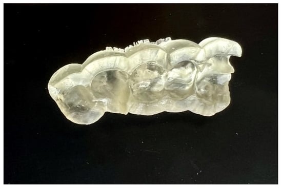 The guide should be printed from resin dedicated for surgical guides—a class IIa product that can be sterilized and safely used in the oral cavity (Figure 6) [22]. The entire digital workflow is presented in Figure 7.