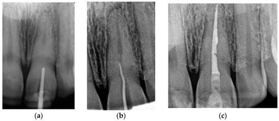 Radiographic examination was used to confirm (a) correct path of access pathway during procedure and (b) correct root canal access; (c) post-obturation radiograph.