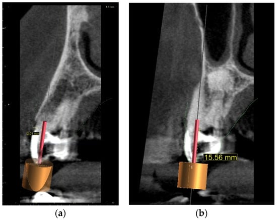 CBCT image presenting (a) virtual implant positioned through the centre of the buccal root, preserving a safe amount of the tooth’s hard tissues; (b) guide tube designed to reach the bottom of the chamber after 15.5 mm. In the lateral dentition area, short guide tubes may ensure more space for the drill.
