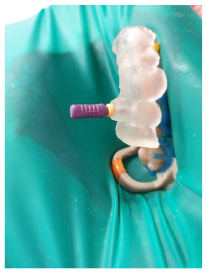 A teeth-supported guide provides good stabilization, eliminates trauma to the gingiva, and allows a clinician to use a rubber dam during the procedure. The guide should cover the labial and palatal surfaces of the three adjacent teeth to secure correct intraoral stabilization (Figure 4). The height of the built-in sleeves should be adapted to the working length of the tools to reveal the visible part of the canal [3].