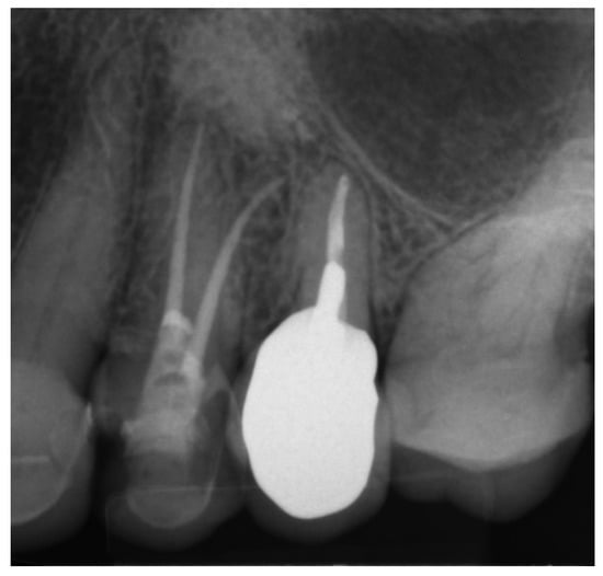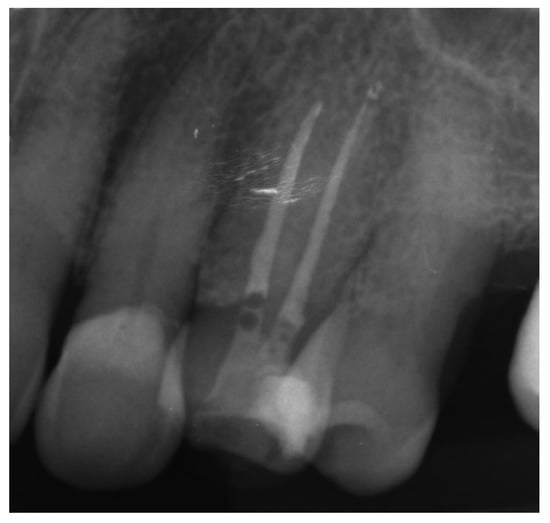 The correct fit of the guide was verified before and after the rubber dam was placed. For local anaesthesia, 1.7 mL Ubistesin forte (3 M ESPE, Seefeld, Germany) was administered (articaini hydrochloridum 40 mg + epinephrine hydrochloridum 0.012/1 mL). A small sign was made on the enamel surface through the guide to indicate the access point. The enamel was removed in a minimally invasive manner with a diamond bur until the dentine was exposed. The guide was placed on the teeth and the treatment was performed with Munce Discovery Bur #1 (CJM Engineering, Santa Barbara, CA, USA) with a speed of 10,000 rpm. This bur was a round carbide bur with a head diameter of 0.8 mm (ISO head size 08) and a total length of between 31 and 34 mm. The guide was removed every 2 mm to rinse the cavity, control endodontic access using an optical microscope, and clean the bur. After the bur reached the estimated depth, the C-Pilot #10 and #15 files (VDW, Munich, Germany) were used to check the canal position. Radiographic examination was performed to confirm correct canal access (Figure 15). The canal was reached at a length of 22 mm from the top of the guide sleeve - 1 mm deeper than the virtually planned depth. Once the remaining canal was reached, the length was confirmed with an electronic apex locator (Raypex 6; VDW, Munich, Germany). A conventional root canal treatment followed. The canal was irrigated with 5.25% sodium hypochlorite (NaOCl), including passive ultrasonic activation, and instrumented with ProTaper Gold (Dentsply Sirona Endodontics, Ballaigues, Switzerland) up to the F3 file size (0.30/0.09v). It was dried with paper points and obturated with vertically condensed gutta-percha and epoxy sealer (AH Plus, De Trey, Konstanz, Germany). The access cavity was cleaned and filled with a composite resin (Estelite Asteria, Tokuyama Dental Corporation, Tokyo, Japan).