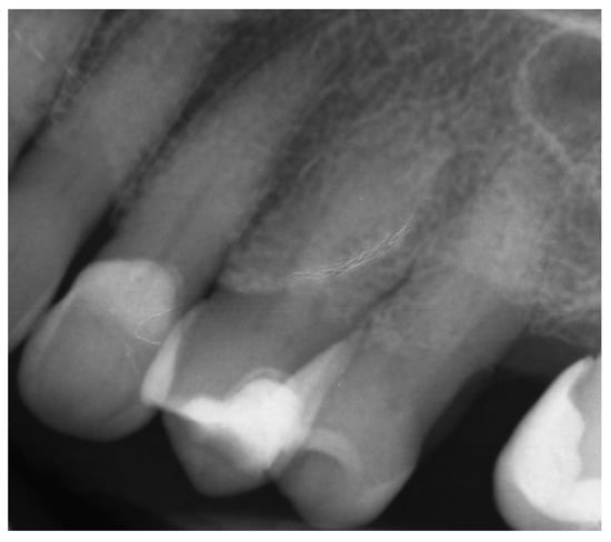 2.1.2. Case Report—Patient B: Asymptomatic Pulp Canal Obliteration after Trauma in Tooth Requiring Prosthetic Treatment (Aesthetic Dental Crown)