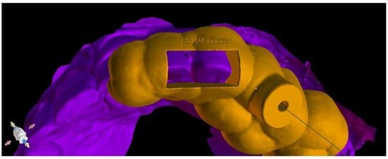 The endodontic guide was planned as in the previous case, using the combined images of CBCT (CS 8100 3D, Carestream, 50 × 50 mm) and the intraoral scan uploaded into the software for virtual planning (Blue Sky Bio). The top of the sleeve was 20 mm from the radiographically visible part of the root canal. The guide sleeve was 6 mm long and 1 mm in diameter (Figure 17).