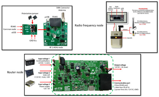 The radio frequency nodes have a port- or connector-type SMA (sub-miniature for high frequency) for the connection with the RF antenna, a double communication port via RS485 protocol, as well as a USB communication port.