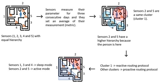 Figure 4 shows the general scheme of the operation of the proposed algorithm. Initially, the nodes are distributed throughout the house, and the person moves freely within it. All sensors require three days to obtain an average value of their measurement metric. When the person spends more time in the same place in the house, the sensors in that area increase their hierarchy and create a cluster. The other sensors remain in their current hierarchy. Sensors with a higher hierarchy are put into active mode and their routing protocol works reactively. The other sensors are put into sleep mode for specific periods and the routing protocol works in proactive mode.