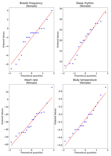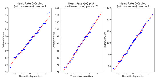 Q–Q plot of measurements captured for two conditions, without and with sensors, for female subjects.