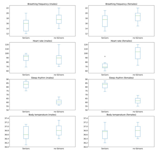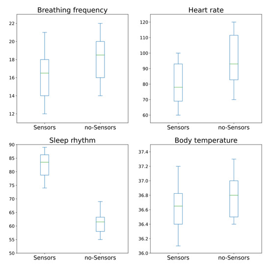 Table 14 shows the results of the paired t-test for all measurements. We observe that, statistically, the means of the conditions in both scenarios, no-sensors and sensors, are different for “Breathing frequency”, “Heart rate”, “Sleep rhythm”, but not for “Body temperature”.
