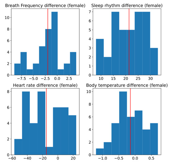 Moreover, the statistical association between the monitored values for “body temperature” for men before and after installing sensors is positive. The same behavior is shown in females. Moreover, the association between these two variables is slightly stronger for men. We are also interested in knowing the effects of the measurements under these different conditions for male and female subjects.