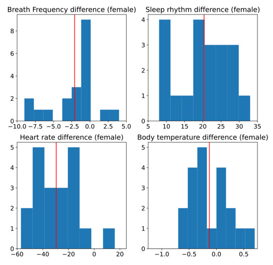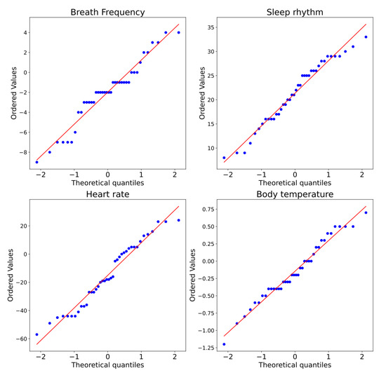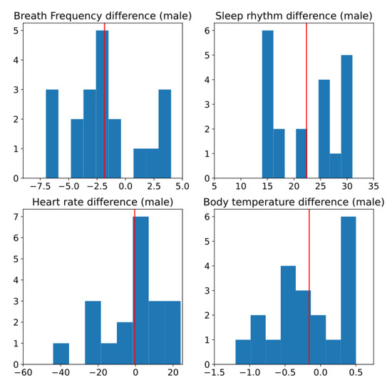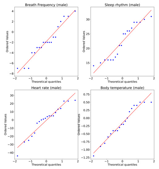 The ratio of the larger to the smaller sample variance for breathing frequency, heart rate, sleep rhythm, and body temperature sensors for males are 1.53213, 0.25152, 0.66405, and 1.15626 respectively; therefore, we consider all measurements to have equal variance.