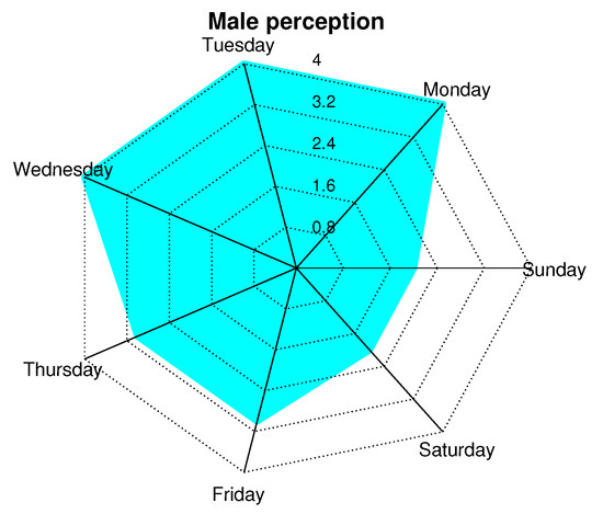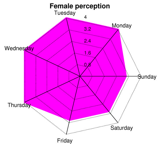 In order to corroborate the perceptions of men and women, we conducted a survey based on a Likert scale with the following values: 0 = very bad, 1 = bad, 2 = OK, 3 = Good, 4 = Great. This survey was conducted every day of the week, and a general average was obtained. Figure 19 and Figure 20 show a radial map of perception, with concentric radii from 0 to 4, which are the previously mentioned sensation values of the scale. We observe that the days when people feel better with the presence of the network is from Monday to Friday and, specifically, on Monday, Tuesday, and Wednesday. In this aspect, both sexes coincide. Subsequently, women have a 10% greater sense of well-being than men. On weekends (Saturdays and Sundays), people feel good (or OK) with the care they could receive from the network. This may be because these are days when people receive more visits from family or friends, so people feel safer because they are not alone.